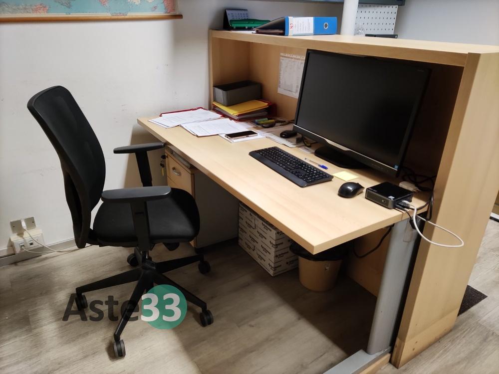 Attaccapanni a colonna;Scrivania con alzata ad uso reception;Cassettiera a tre cassetti;Poltroncina su ruote;Armadio a 4 ante nella parte inferiore, 2 ante e 3 vani a giorno nella parte superiore;Scrivania ad elle con alzata ad uso reception;Cassettiera a 3 cassetti;Poltroncina su ruote;Armadio a 2 ante e 2 cassetti ad uso schedario nella parte inferiore, n....