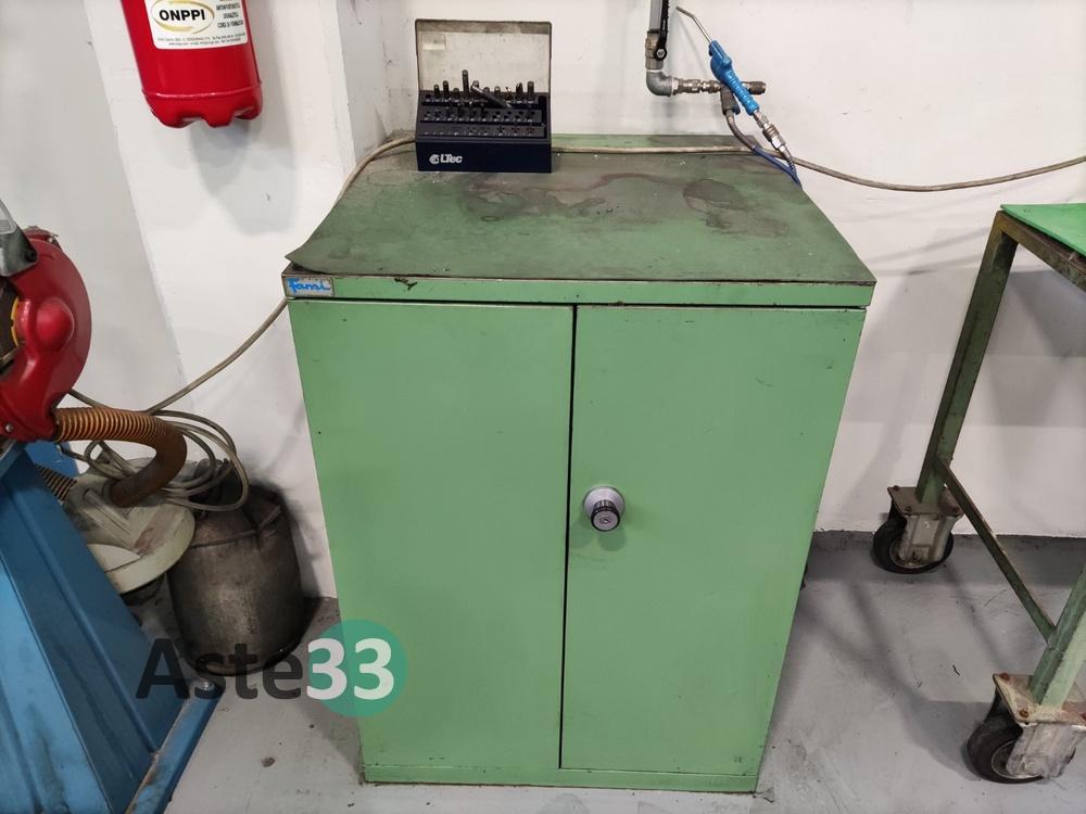 Armadietto basso a 2 ante marca FAMI, e cassetti estraibili con accessori per tornio.