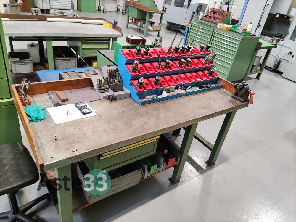 Banco da lavoro in metallo con smontaconi, cassettiera, n.2 porta coni 18 accessori, punte ed accessori in sorte.