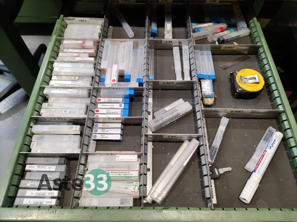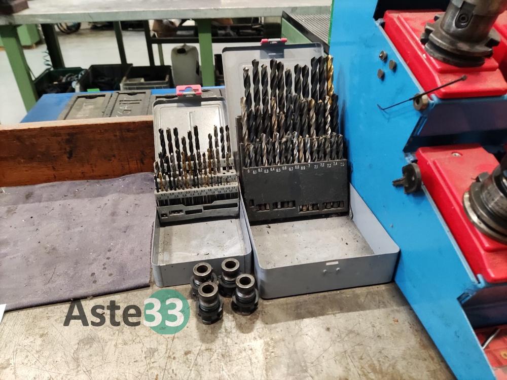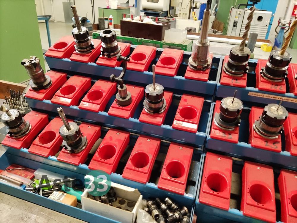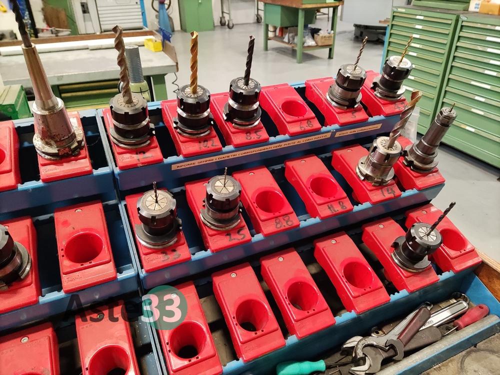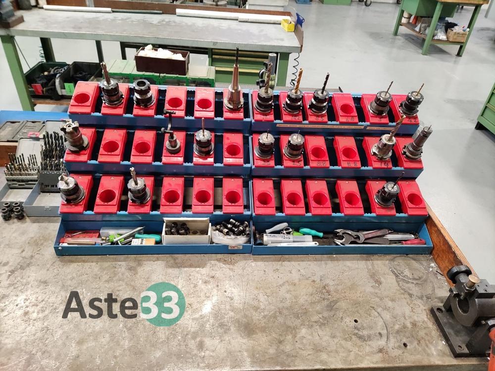 Centro di lavoro verticale C.B. Ferrari, modello B130, seriale 2002525, con cambio utensili (n.15 utensili) ed accessori;Banco da lavoro in metallo con smontaconi, cassettiera, n.2 porta coni 18 accessori, punte ed accessori in sorte.
