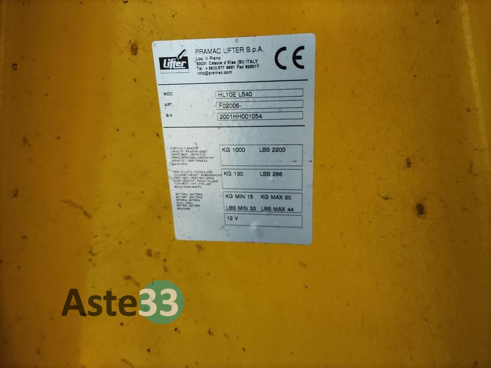 Transpallet manuale con alzata elettrica (danneggiato), PRAMAC LIFTER spa, mod. HL10E L540, sn. 2001HH001054, portata 1000kg;