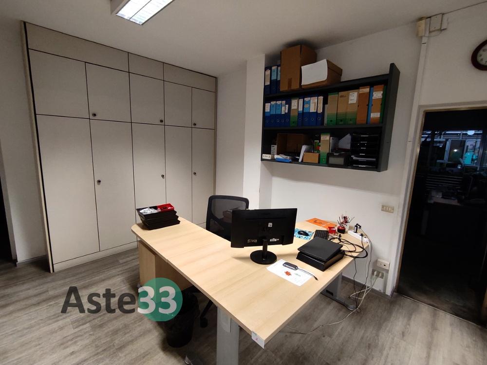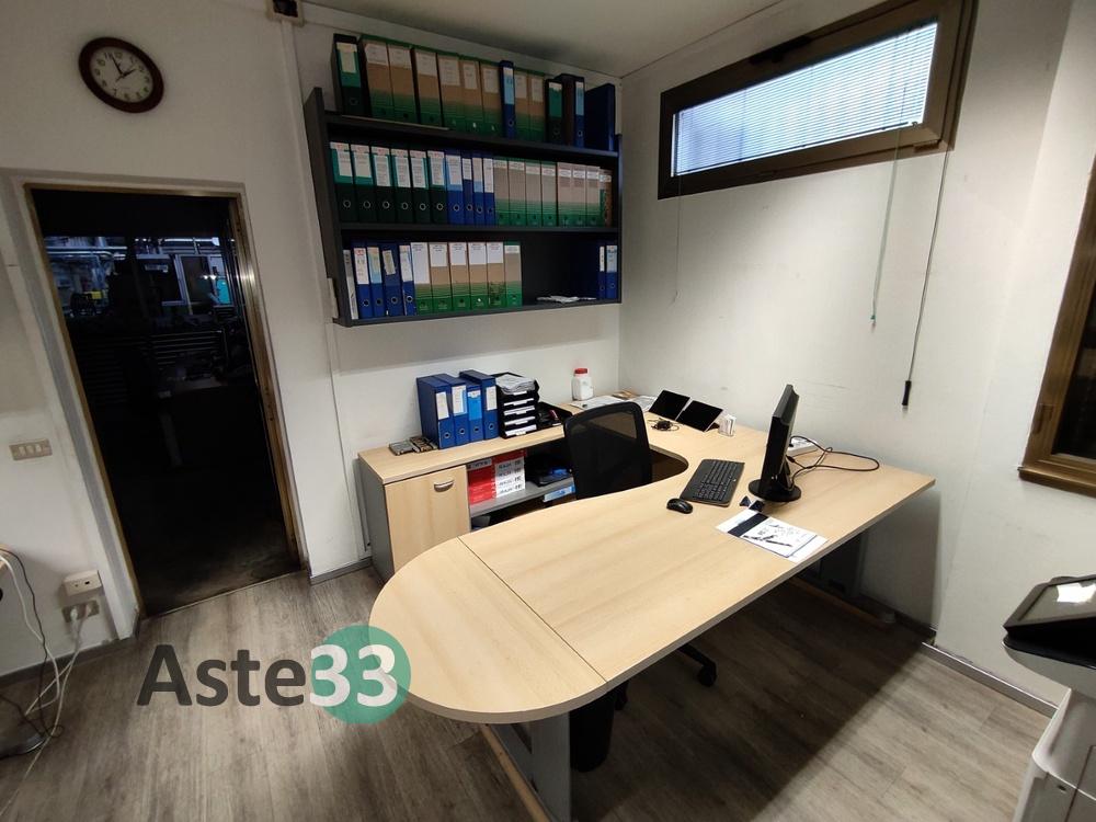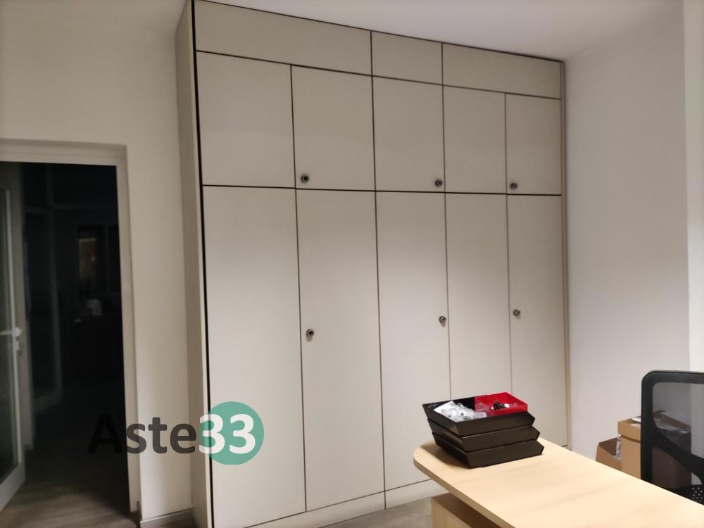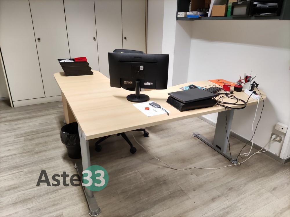 Scrivania con penisola;Poltroncina su ruote;Cassettiera a 3 cassetti;Mobiletto basso ad 1 anta e 2 vani a giorno;N. 2 mobili pensili a 2 vani a giorno;Appendiabiti a colonna;Scrivania a penisola;Cassettiera a 3 cassetti;Poltroncina su ruote;Armadio a parete a 5 ante inferiori e 5 ante superiori.