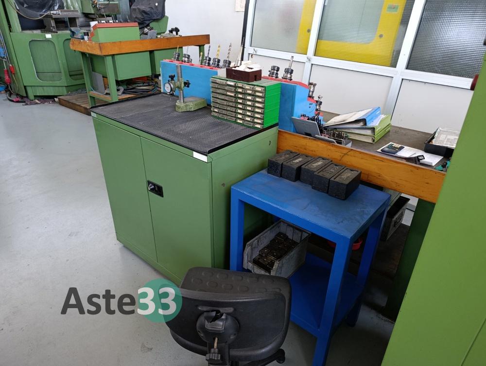 Arredamento per zona produzione composto da banchi da lavoro, mobili, vasca di contenimento liquidi, postazioni pc ed attezzature in sorte