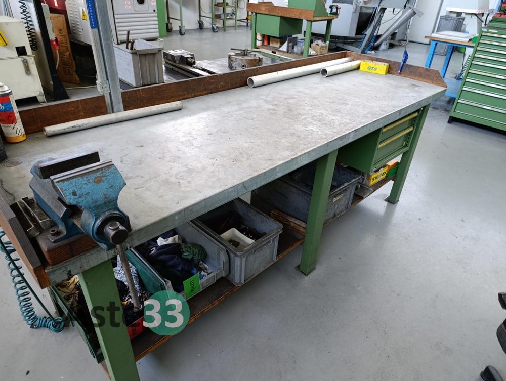 Banco da lavoro metallico con piano in legno, dimensioni 253x83cm, con cassettiera a
