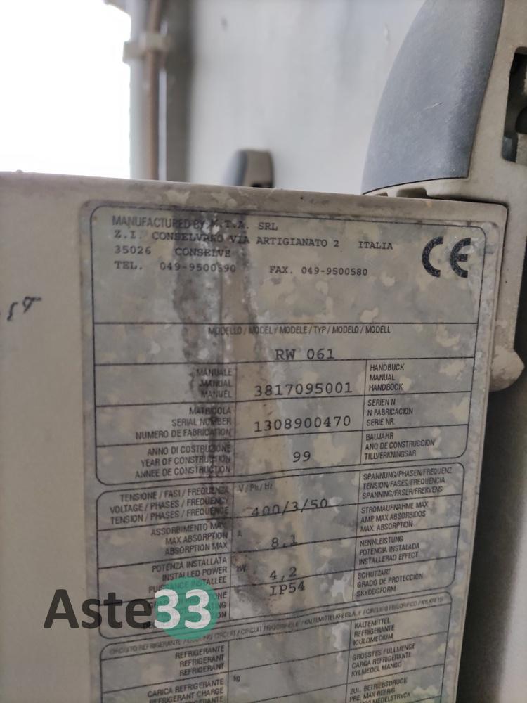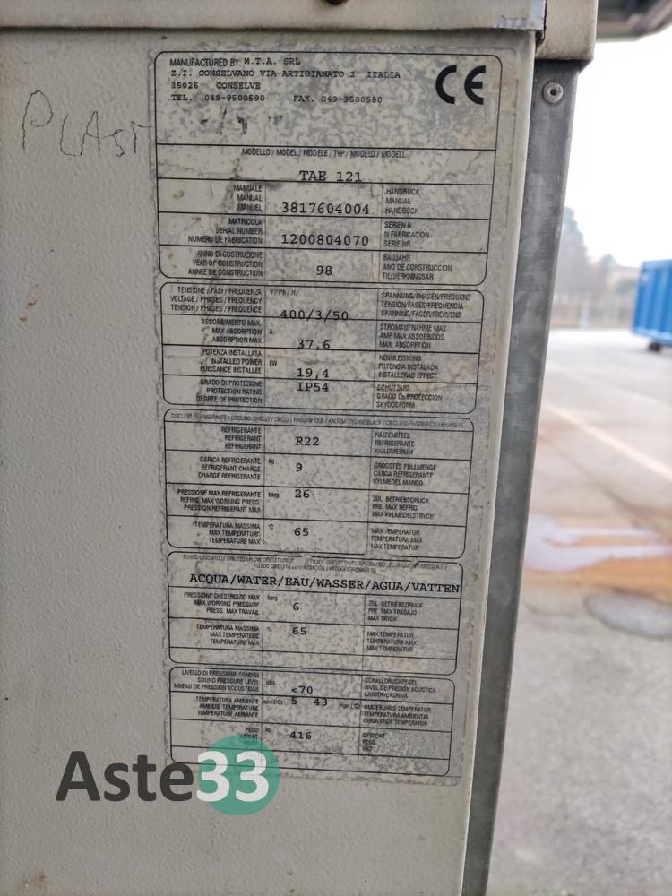 Refrigeratore/Scambiatore di calore MTA, TAE EVO 121, matricola 2200055589, anno 2005;Refrigeratore/Scambiatore di calore MTA, TAE EVO Tech 201, matricola 2200301921, anno 2017;Refrigeratore/Scambiatore di calore MTA, RW061, matricola 1308900470, anno 1999;Refrigeratore/Scambiatore acqua MTA Srl, matricola 1200704815, anno 1997;Refrigeratore/Scambiatore acqua MTA Srl mod. TAE...