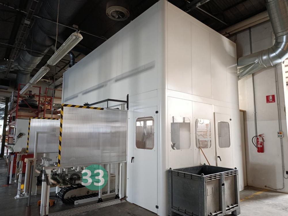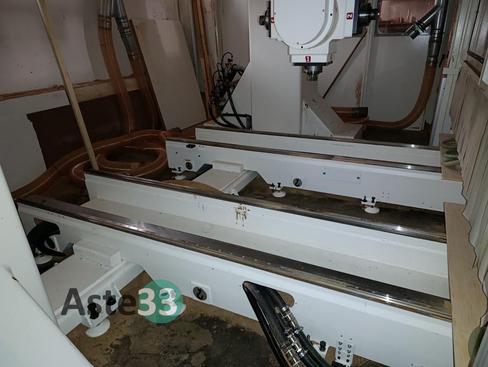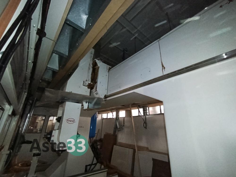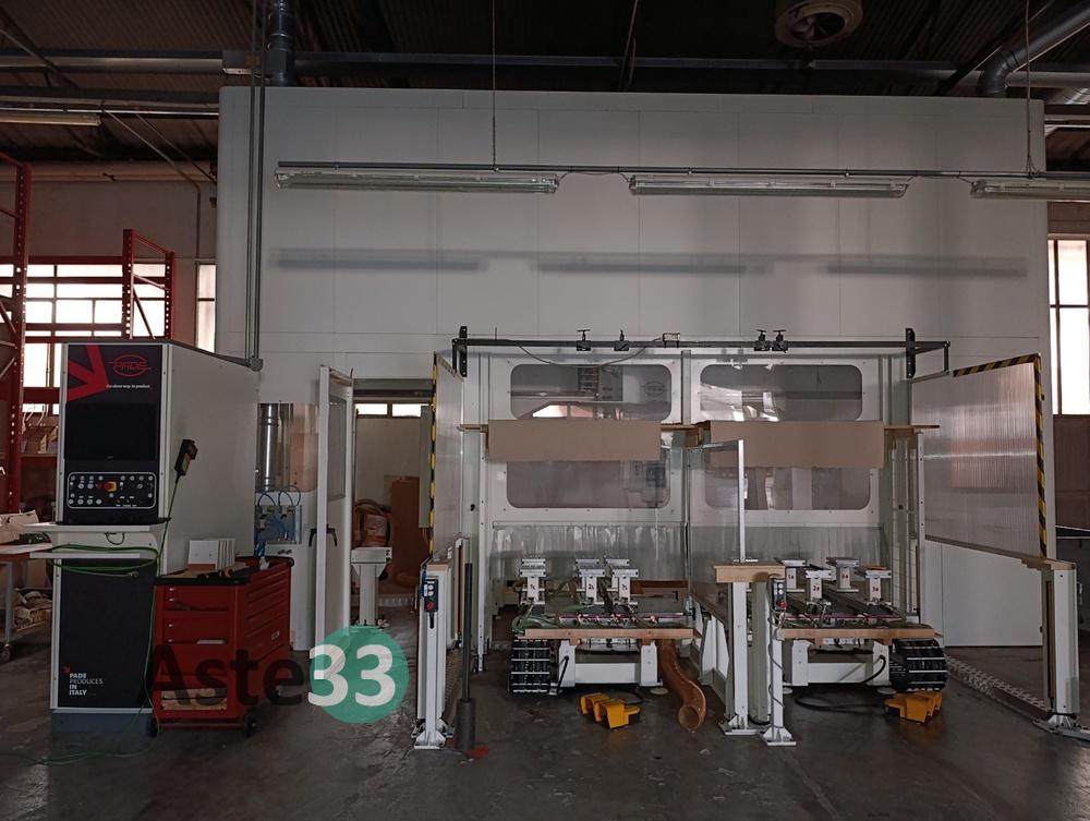 Centro di lavoro a portale per lavorazione del legno, a 5 assi, marca PADE, mod. SPIN, matricola 13153, anno 2021, completo di quadro comando PLC, 2 banchi per lavorazione, cabina insonorizzata, 2 pompe a vuoto e relativo impianto di fotocellule per sicurezza.